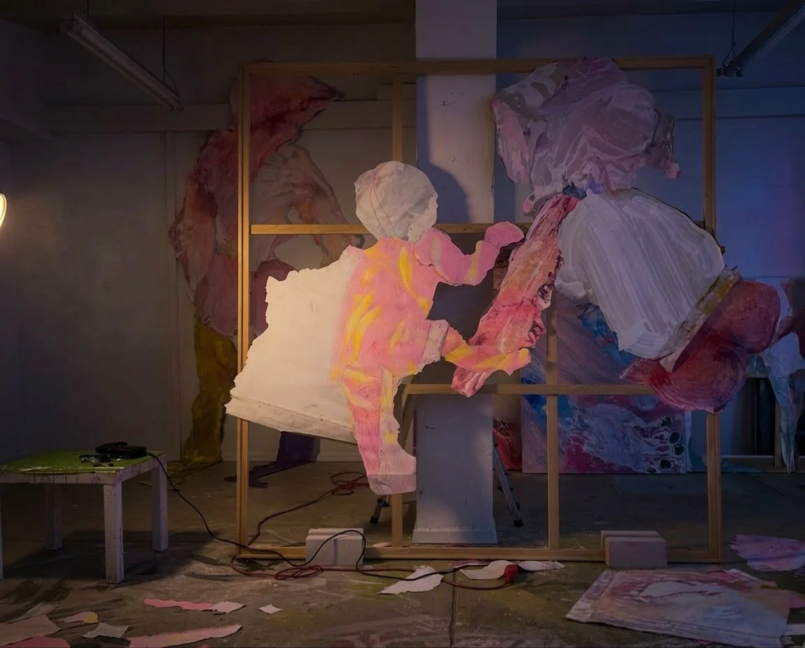 In her latest series, Ana Pušica transitions from the surface of the canvas to the volume of the object. By hand-sewing and stuffing her paintings, she transforms the "sweet dream" aesthetics—ochre, pink, and green—into a heavy, physical presence.
